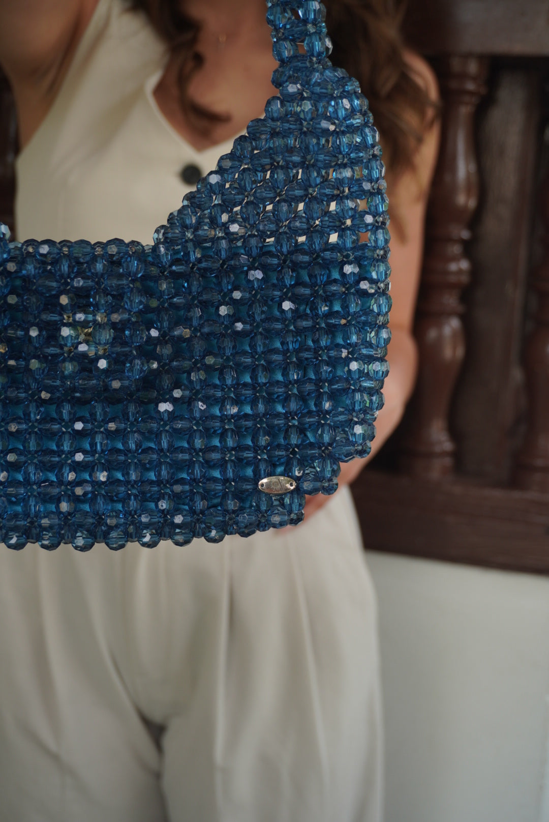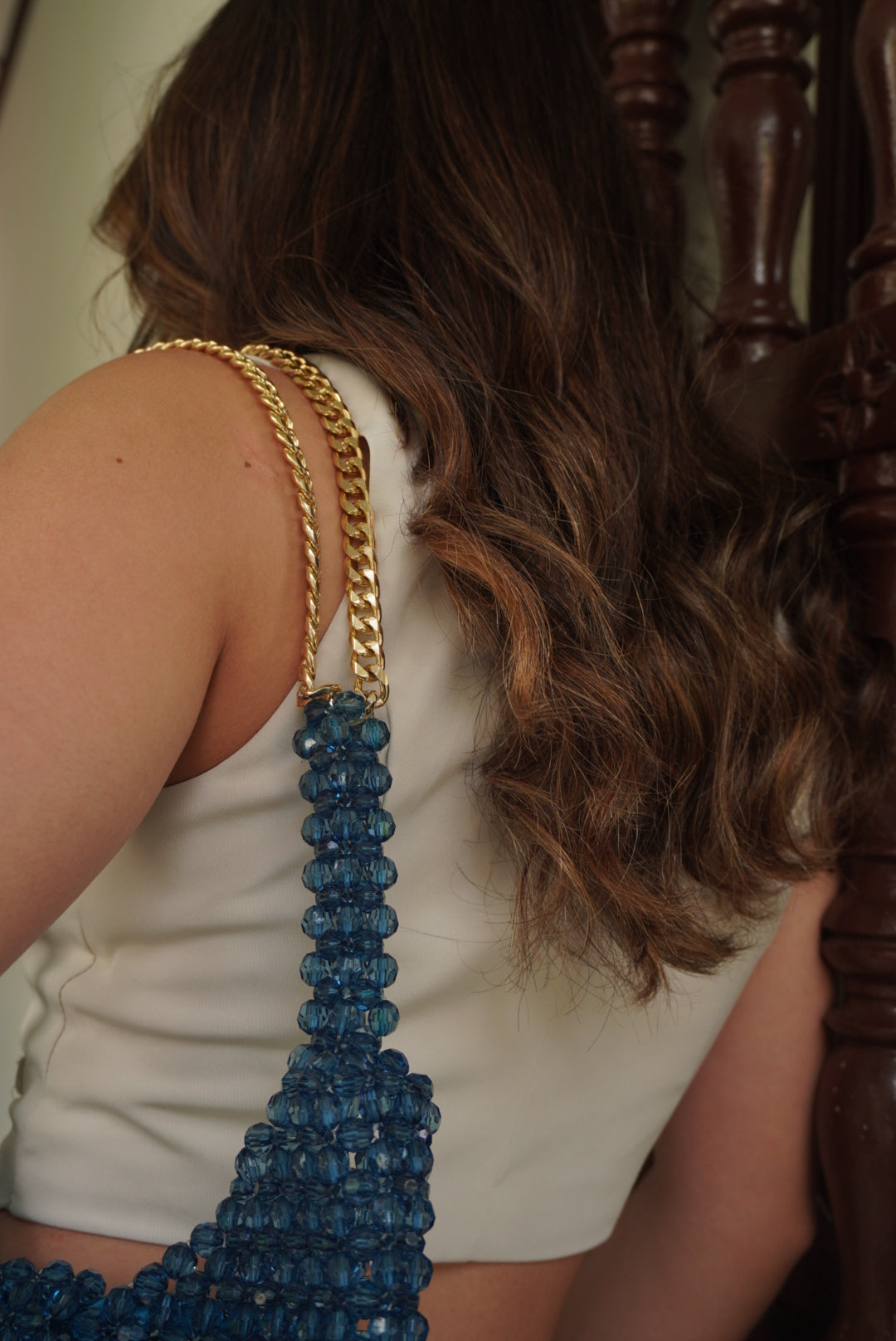 Aqua es frescura y sofisticación en un solo bolso. Tejido a mano en piedras acrílicas azul profundo y forrado en seda, refleja la serenidad del mar con un brillo cautivador. Su agarre, que combina cadena dorada y tejido artesanal, logra el equilibrio perfecto entre modernidad y lujo.