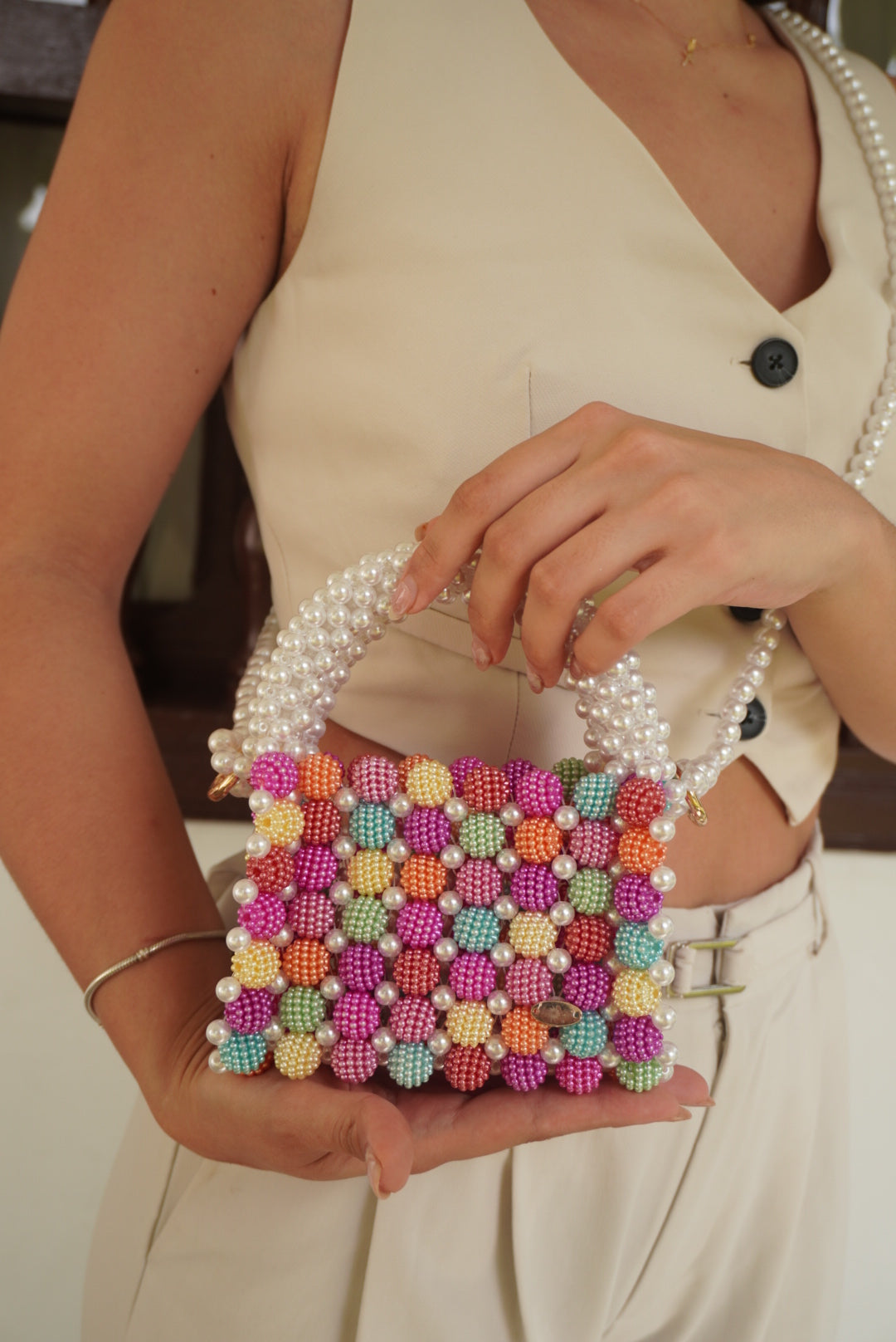 Candy es una de nuestras best sellers, tejida a mano con esferas acrílicas vibrantes unidas por perlas que aportan un toque delicado y sofisticado. Pequeña pero impactante, transforma cualquier outfit con frescura, ligereza y mucha personalidad.