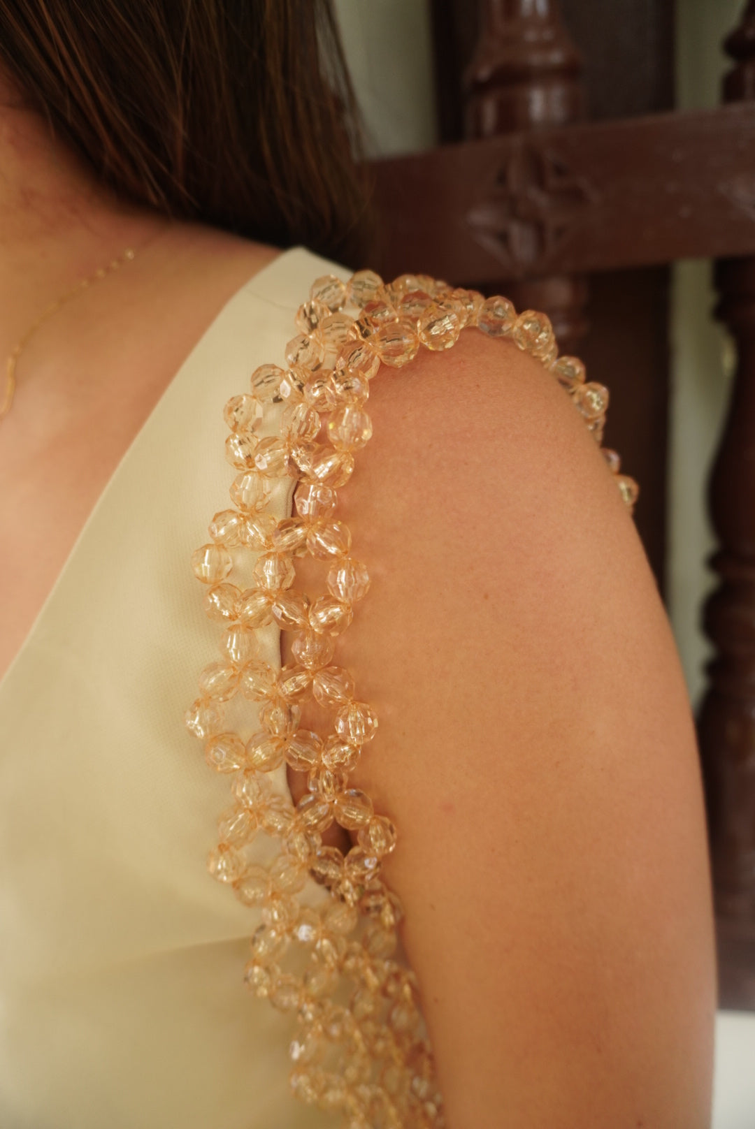 Nuestro best seller por excelencia, Champaña Ocre deslumbra con su brillo cálido y sofisticado. Tejido a mano en piedras acrílicas y forrado en seda, combina lujo y suavidad. Su cordón dorado añade el toque distintivo que lo convierte en una pieza única, atemporal y elegante.