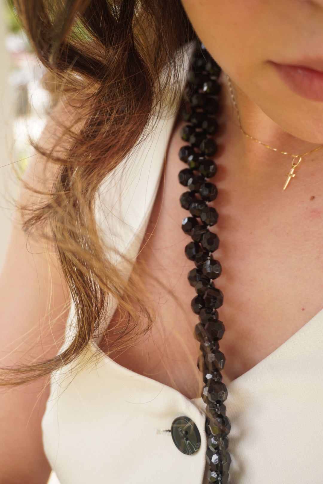 Misterio encarna la elegancia nocturna. Tejida a mano en cuentas negras que reflejan la luz con sutileza, combina sofisticación y practicidad en un diseño tipo mochila con lazo en satén. Un accesorio pensado para acompañarte con estilo y magnetismo.